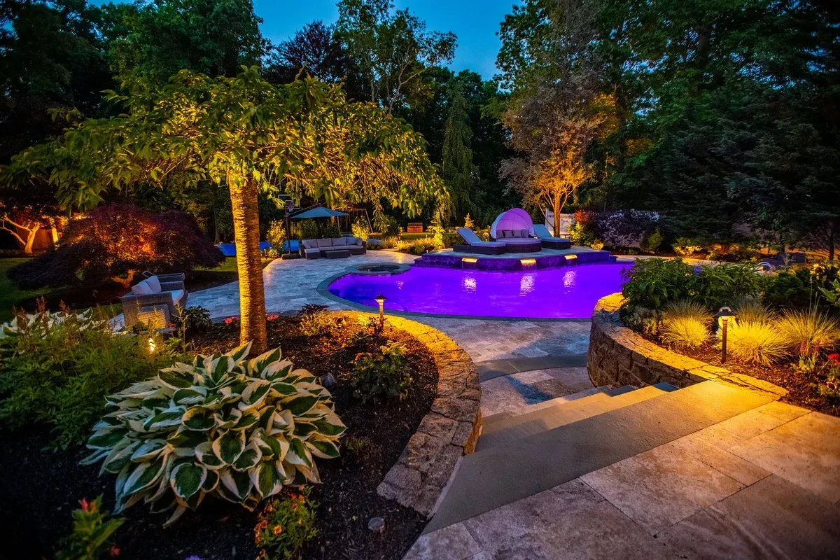 Our landscaping services focus on full-scale residential installation, including 3D landscape designs and CAD drawings that define scope before construction begins. We install trees, relocate existing plant material, perform new lawn installation with soil preparation, sod, or seed, and integrate drainage solutions Melville NY properties require. Landscape lighting systems, artificial turf, and putting greens are incorporated with precision planning.